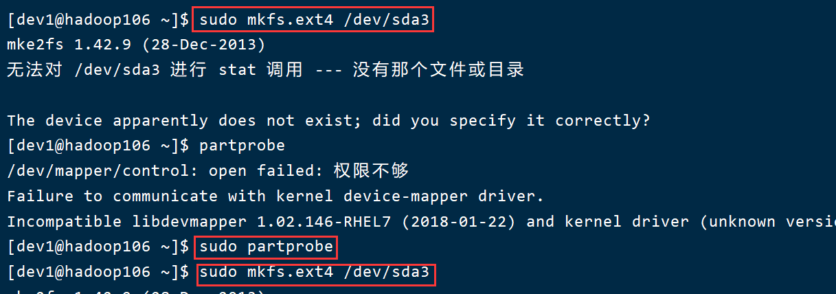 注意:如果执行命令sudo mkfs.ext4 /dev/sda3出现如上图错误,是因为你的内核没有和分区同步,所以可以在终端直接输入sudo partprobe重新读取分区表即可,然后再次执行命令:sudo mkfs.ext4 /dev/sda3,如下图所示:
