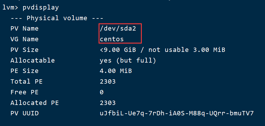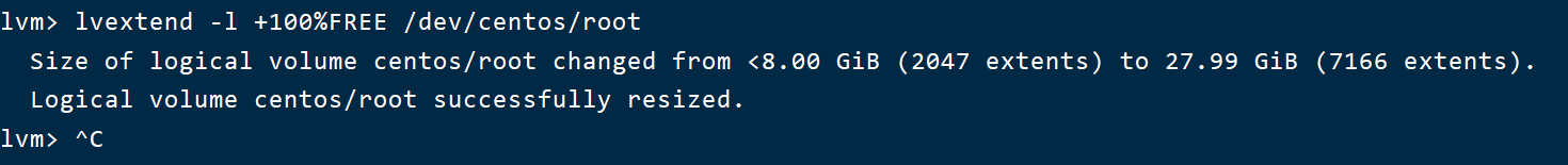 将卷组剩余空间(刚添加的20G)添加到逻辑卷/dev/centos/root : lvm> lvextend -l +100%FREE /dev/centos/root