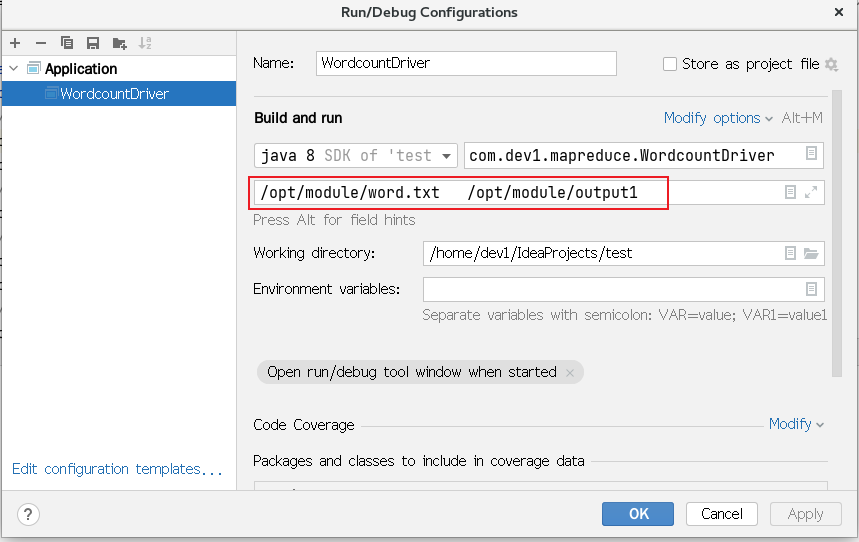 com.dev1 .wordcount.WordcountDriver /user/dev1/input /user/dev1/output