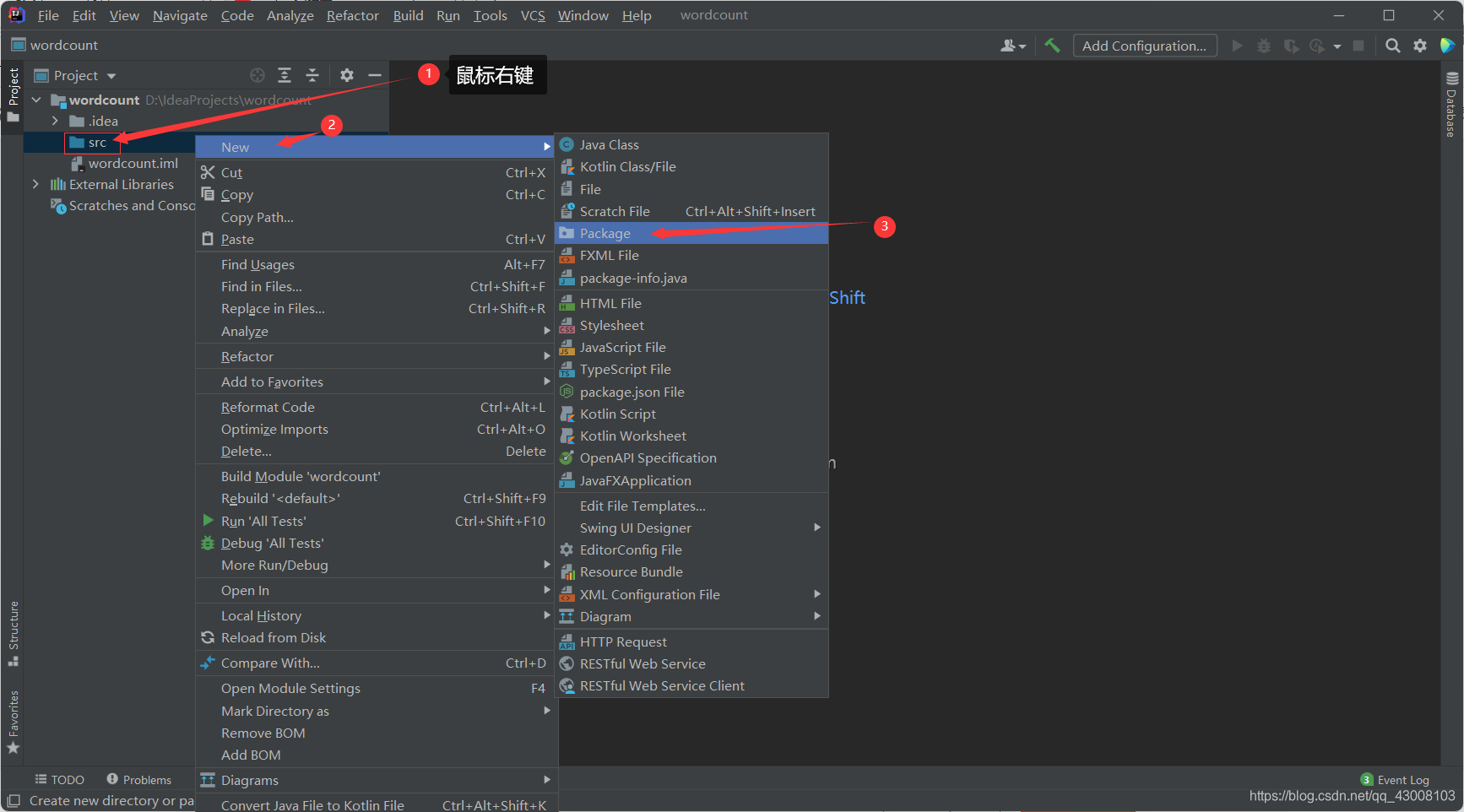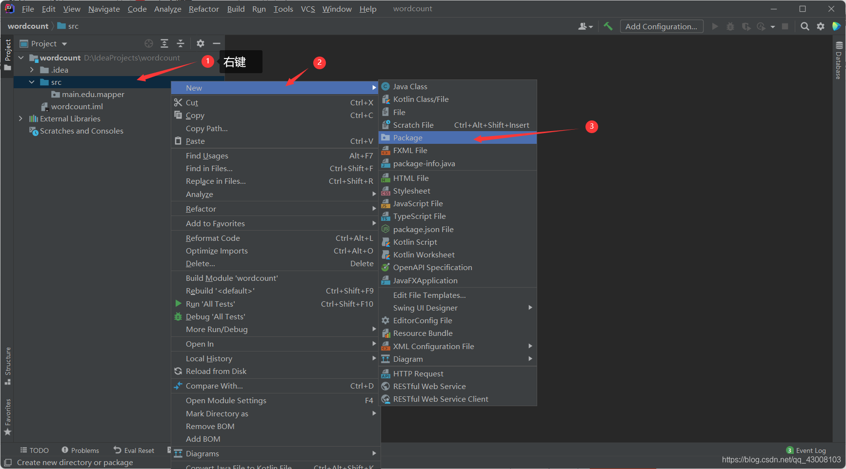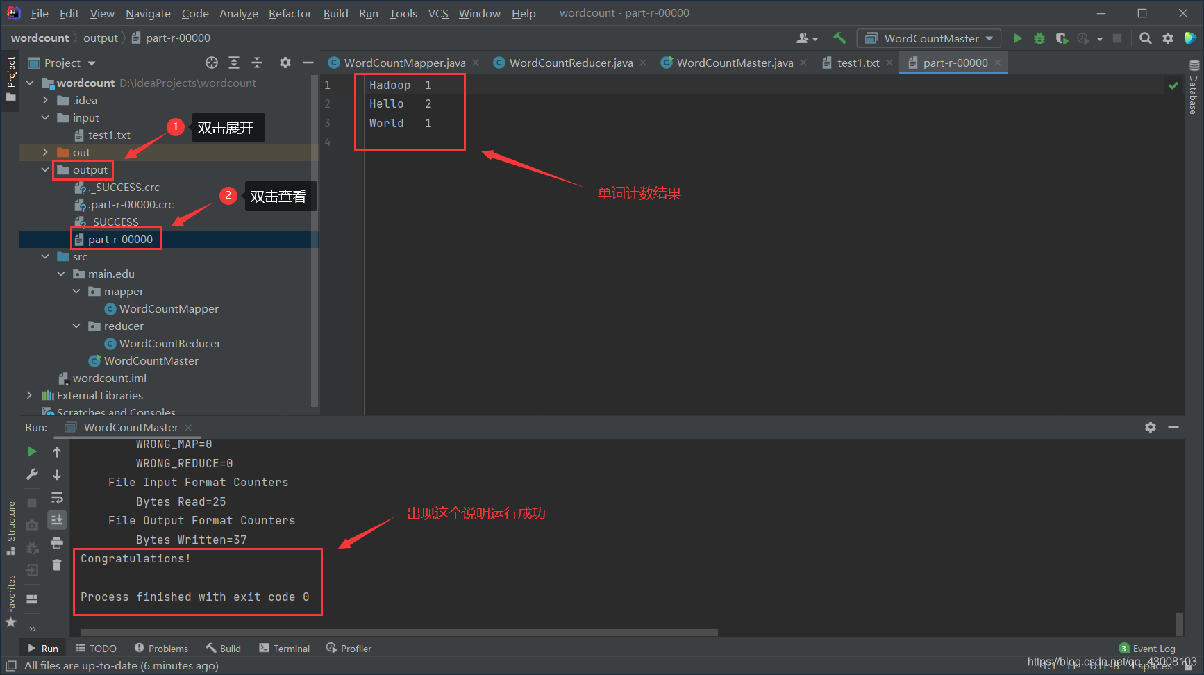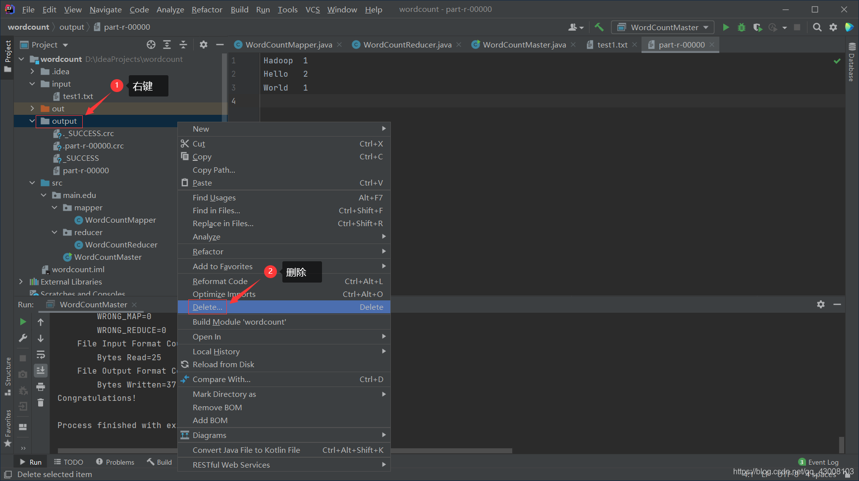等待运行完成会发现项目目录下多了一个output文件夹, 打开里面的‘part-r-00000’文件就会发现里面是对你输入字符串的出现个数的统计。