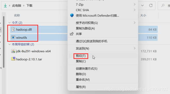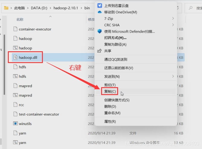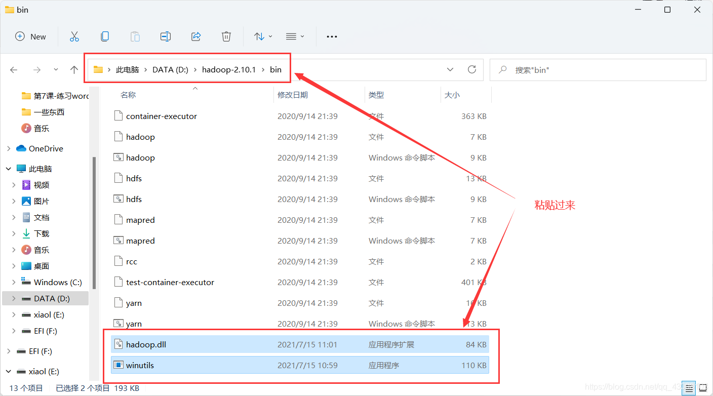 ?下载好hadoop.dll和winutils.exe后,把他们移动到hadoop的bin目录下D:\hadoop-2.10.1\bin