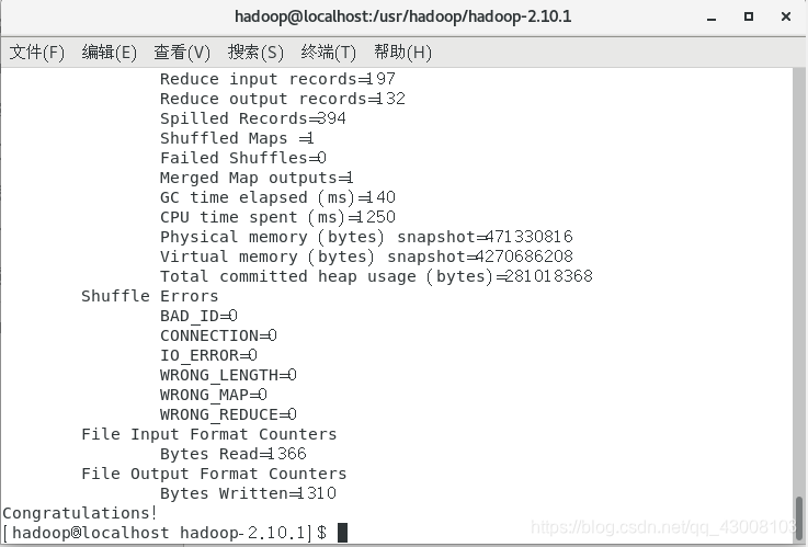 查看里面的‘part-r-00000’文件就会发现里面是对你输入字符串的出现个数的统计。