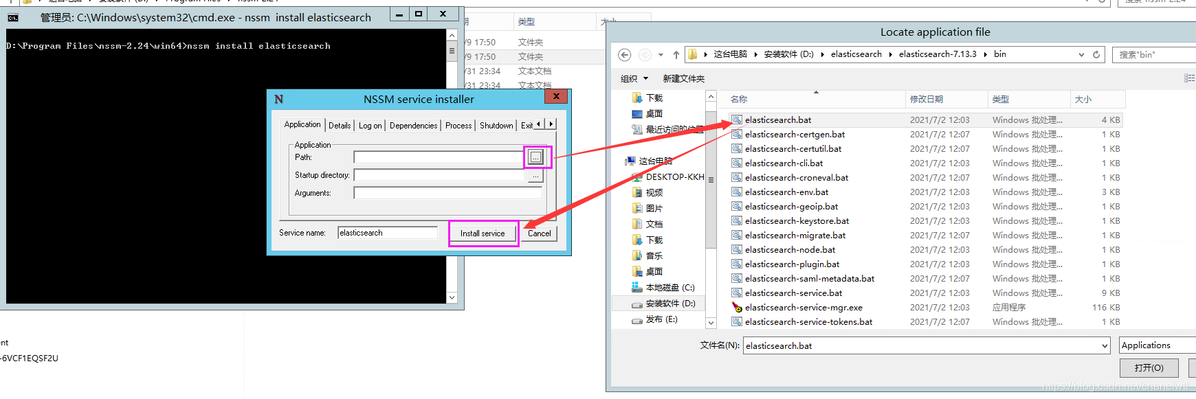 输入:nssm install elasticsearch