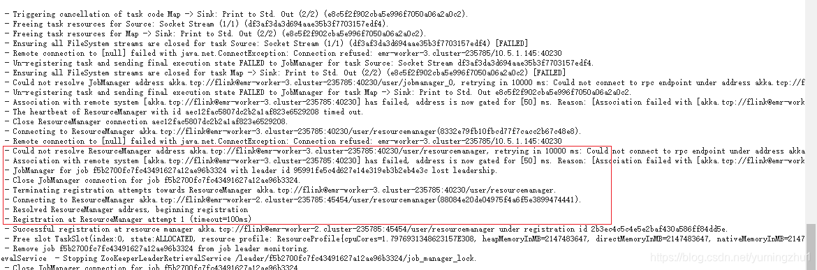 ?task manager 上对应日志如上,与旧的job manager 的ResourceManager通信,当超时大于10s后,将其标记为失败,之后根据zookeeper去注册到新的job manager? ???ResourceManager 上个上