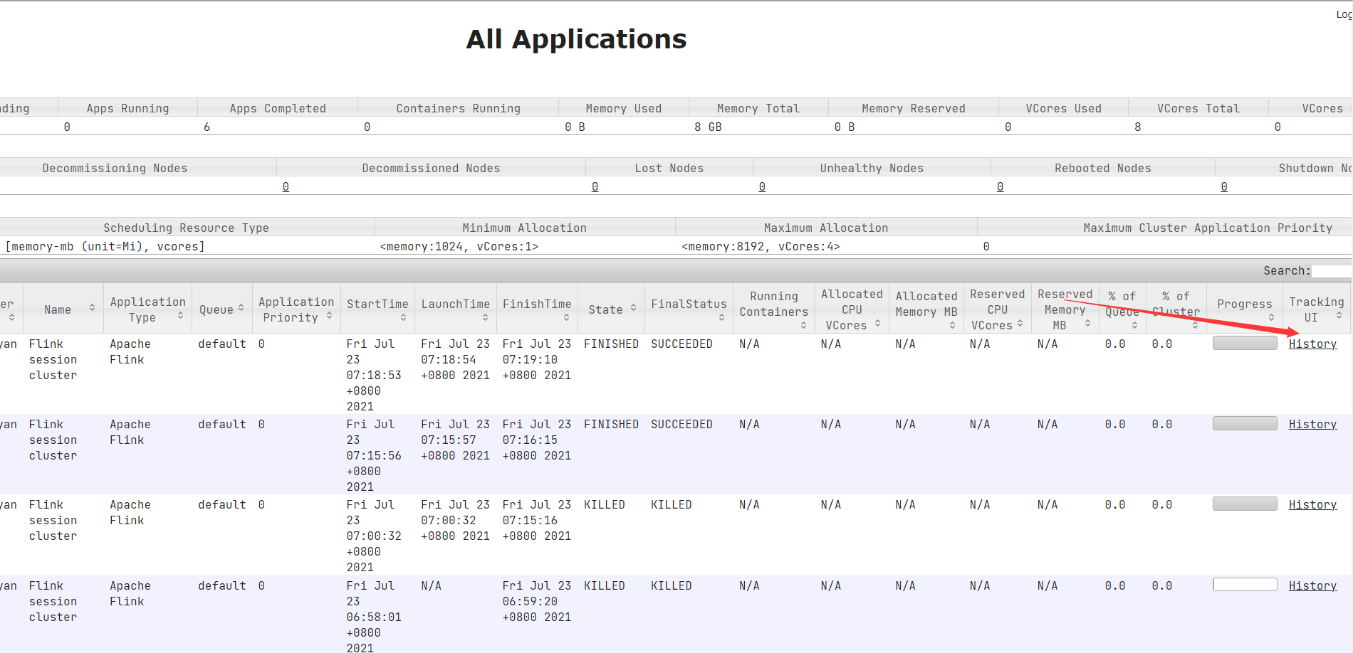 启动之后进入YARN的管控台可以看到  点击对应的会话的Tracking UI可进入当前运行的Flink集群的管控台页面,如下:
