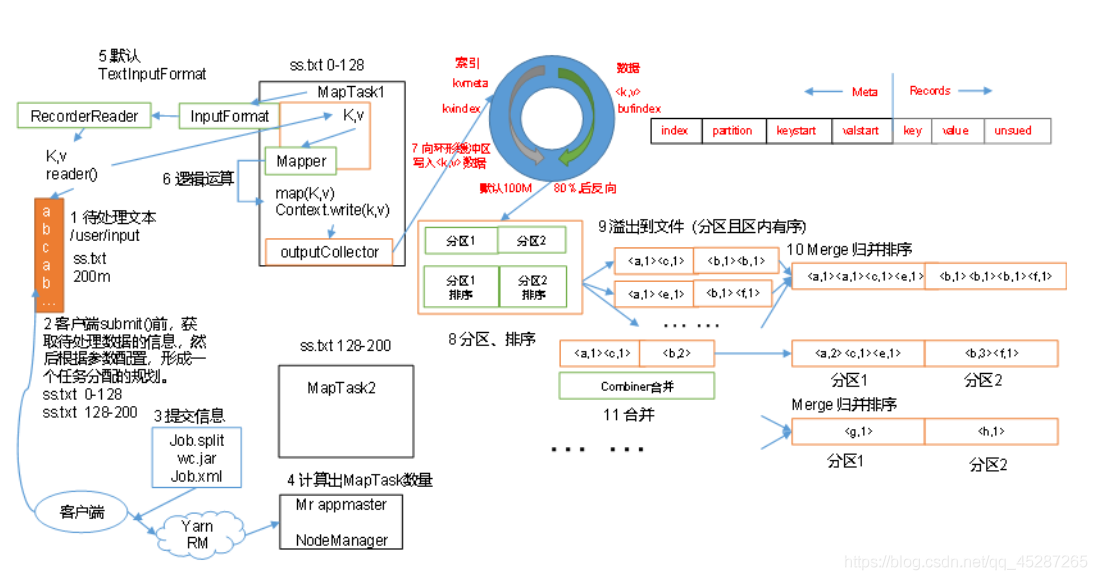 对于MapTask,它会将处理的结果暂时放到环形缓冲区中,当环形缓冲区使用率到达一定阈值后,再对缓冲区中的数据进行一次快速排序,将这些有序数据溢写到磁盘上,而当数据处理完毕后,它会对磁盘上所有文件进行归并排序。