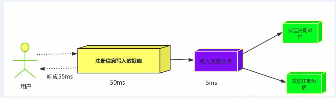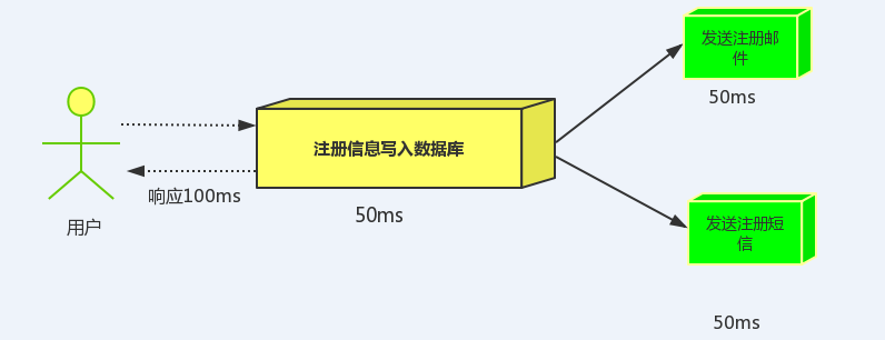 将注册信息写入数据库后,发送注册邮件,再发送注册短信,以上三个任务全部完成后才返回给客户端。这有一个问题是,邮件,短信并不是必须的,它只是一个通知,而这种做法让客户端等待没有必要等待的东西