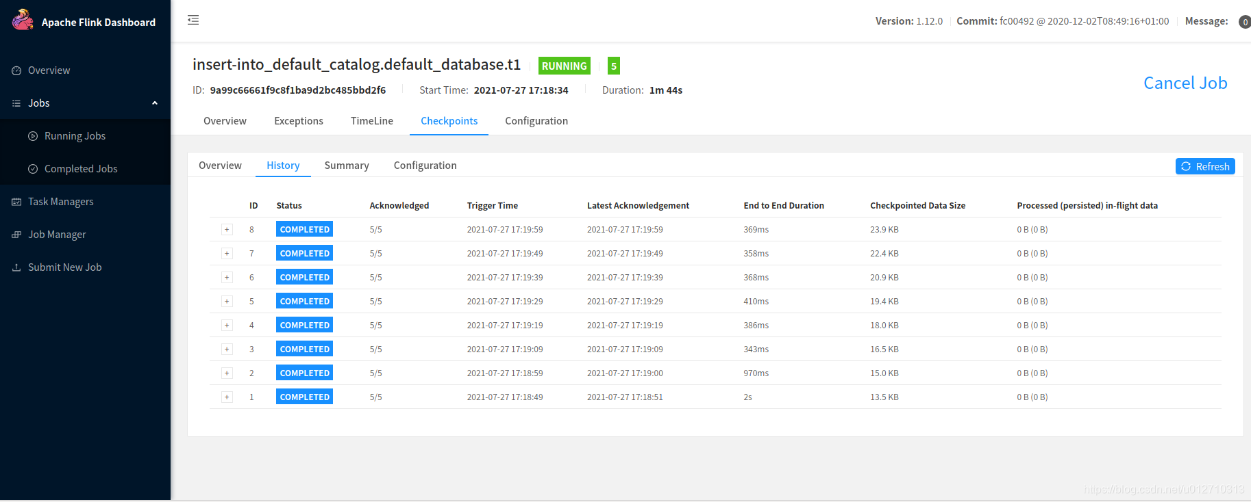 运行main程序,查看日志输出的端口,访问flink web界面看到程序正常运行以及checkpoint正常就ok了