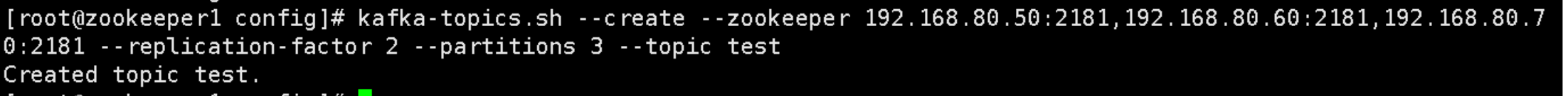 kafka-topics.sh --create --zookeeper 192.168.80.50:2181,192.168.80.60:2181,192.168.80.70:2181 --replication-factor 2 --partitions 3 --topic test