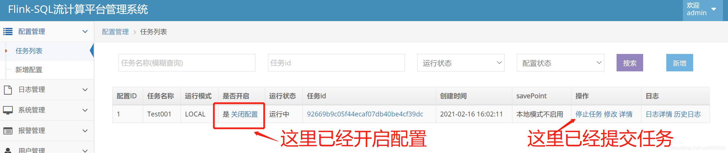 - 依次点击 开启配置 -> 提交任务