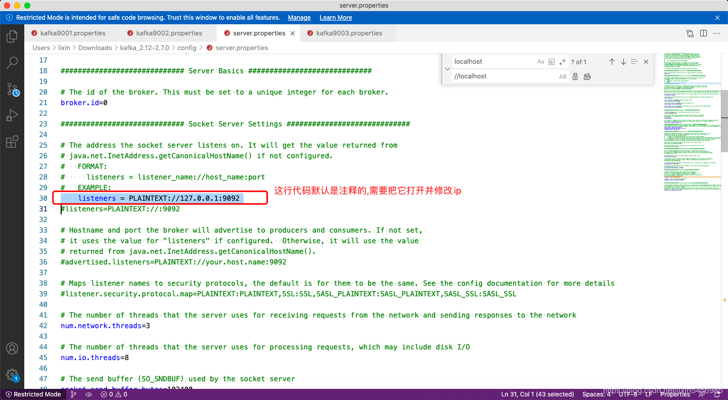 4.进入config文件夹找到 server.properties文件打开,打开listeners = PLAINTEXT://127.0.0.1:9092代码的注释并修改ip,然后保存修改并退出.