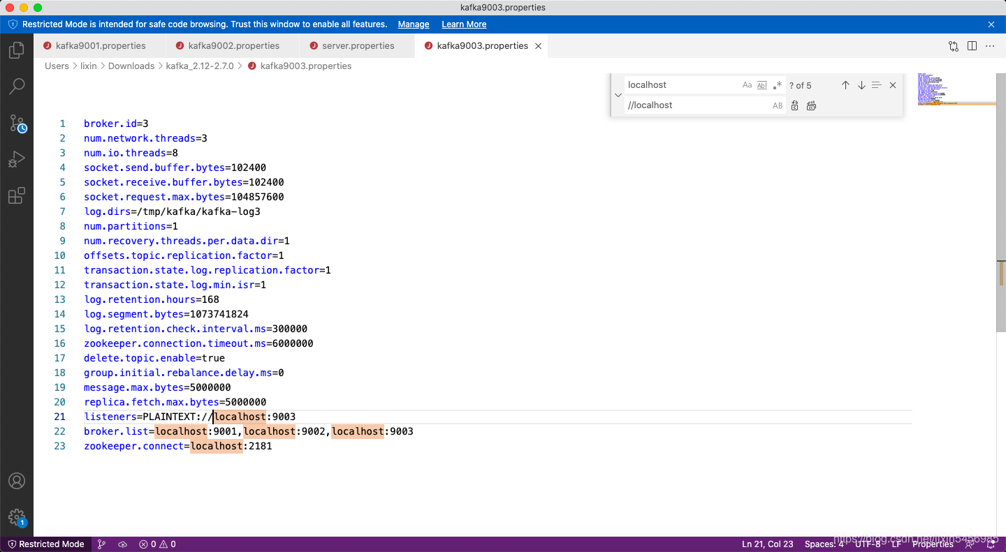 6.准备3个配置文件,放在kafka_2.12-2.7.0文件夹下