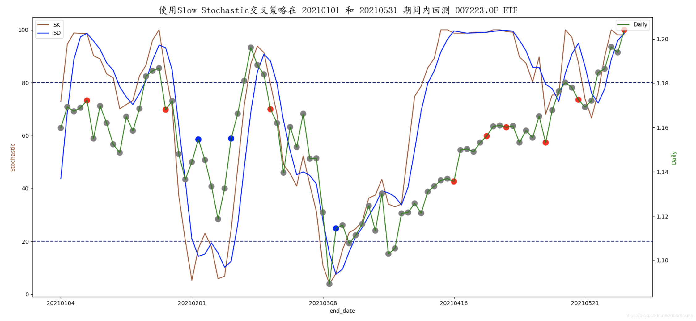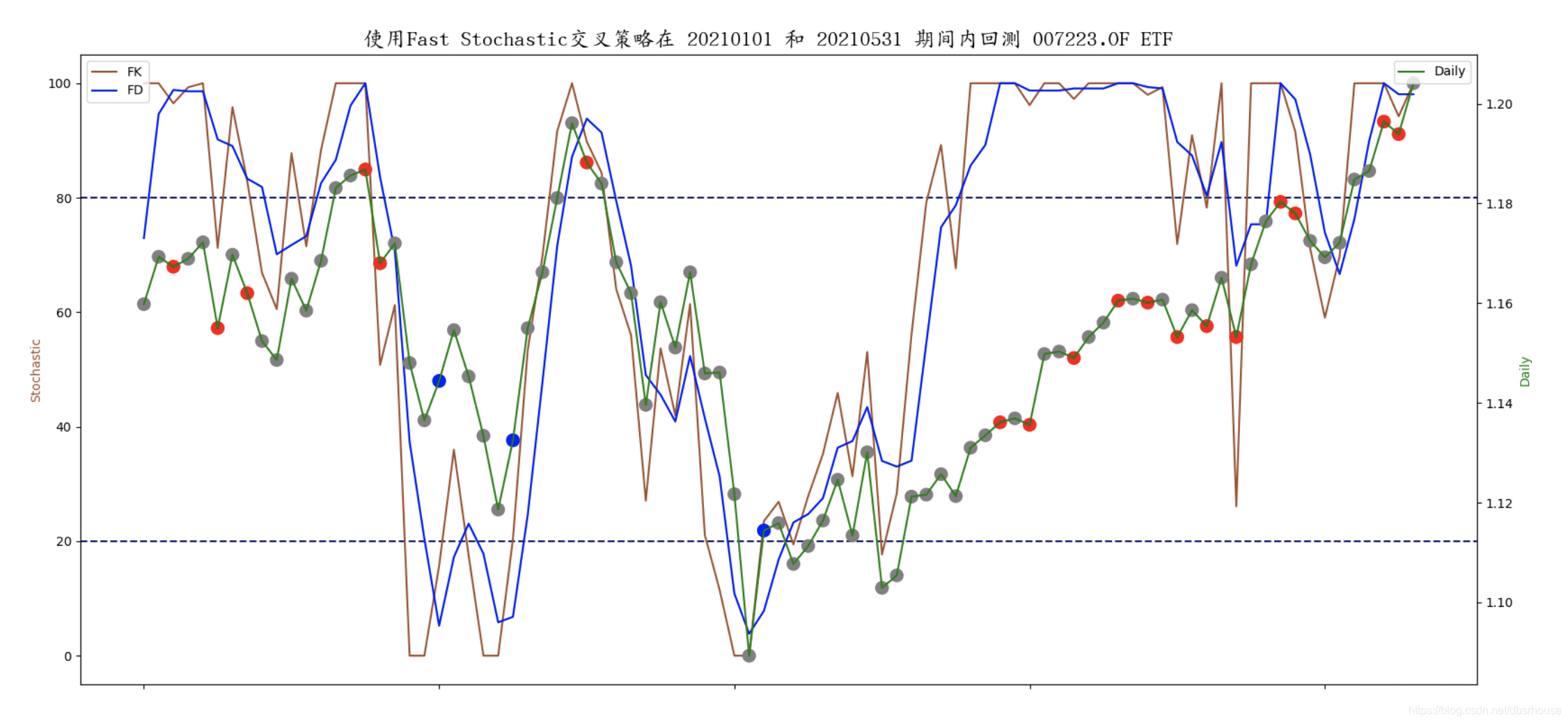 ?????????使用图表来观察值的变化要容易得多。在本文中,我们将回测应用于Tushare大数据开放社区提供的股票型公募基金,并专注于将 Elasticsearch 作为分析工具。 下面的例子随机选择了"工银研究精选股票" (代码为000803.OF) ,并另外抽取10只股票型基金运行,结果将在最后的段落汇总和展示。数据选自2021年01月01日到2021年05月31日之间的时间范围。在下图中,随机指标 (FK/SK) 和信号线 (FD/SD) 与每日收盘价一起绘制。 在每日价格曲线中,卖出信号的价格标为红色,而买入信号的价格标为蓝色。 如下图所示,慢随机指标产生的信号数量略少于快速随机指标。