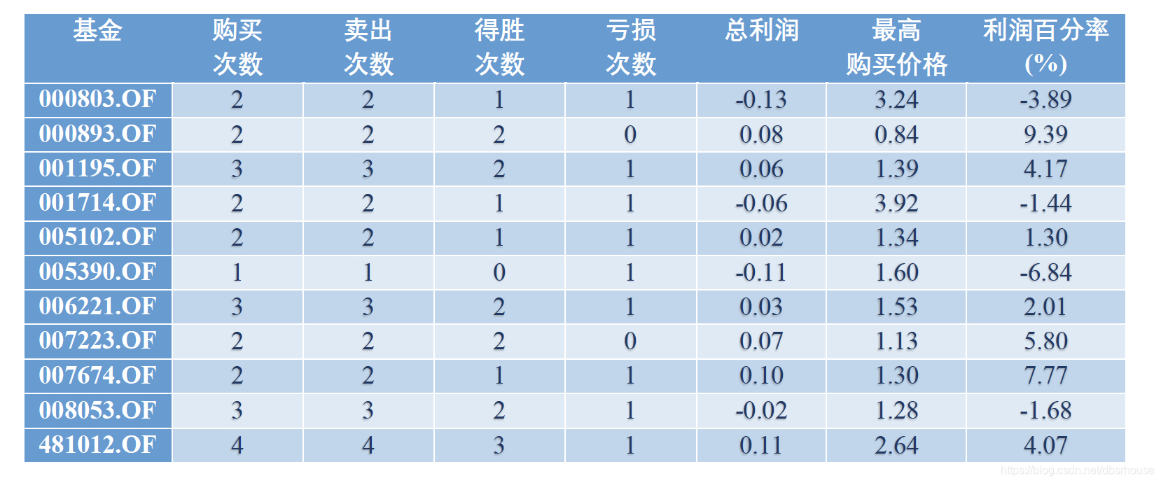 ????????从2021年01月01日到2021年05月31日,11只股票型基金运行简单型随机交易策略的结果汇总和展示如下表。结果表明,这个交易策略不一定可以获利。大多数交易者的建议不要根据单一指标进行交易。