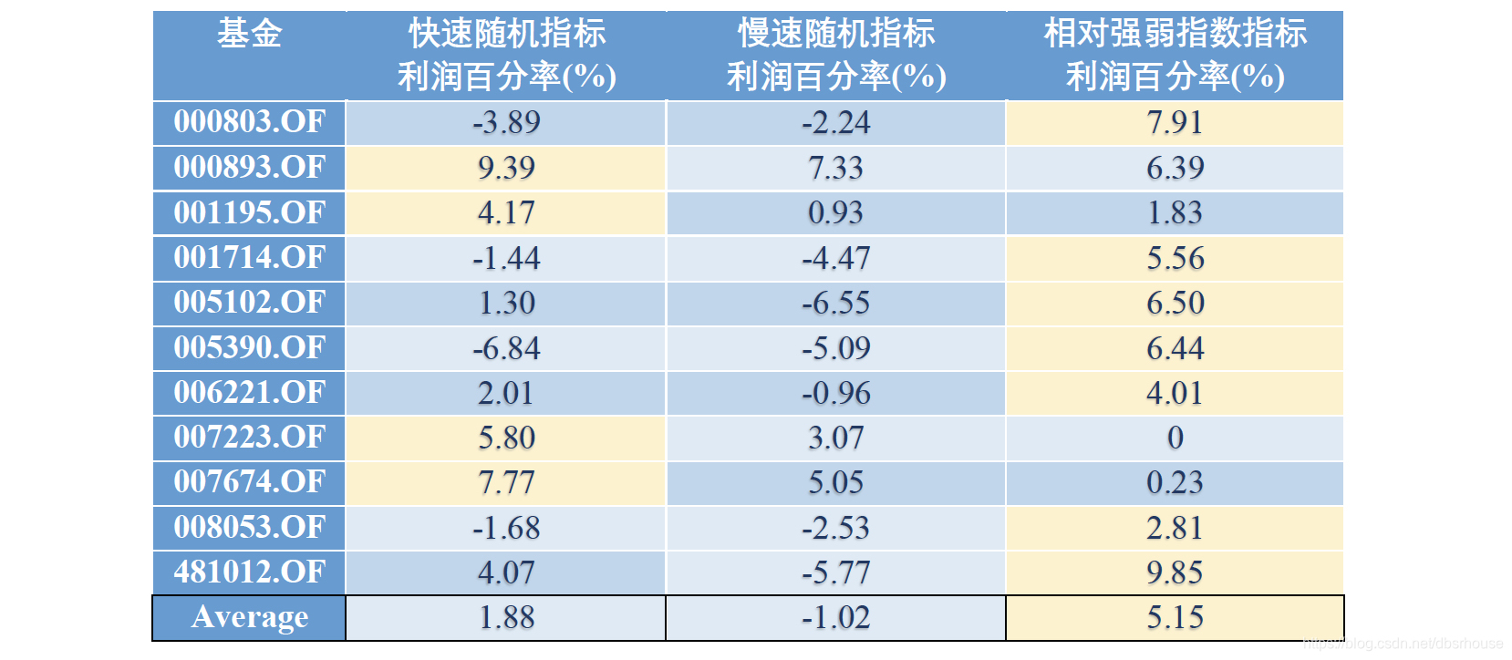????????下表为本次实验中,使用快速随机指标、慢速随机指标和相对强弱指数指标之间的收益。 在表格中显示相对强弱指数指标比其他两个指标具有更高的收益。然而,有一只基金在 RSI 中没有提供信号,但快速和慢速随机指标均获利。