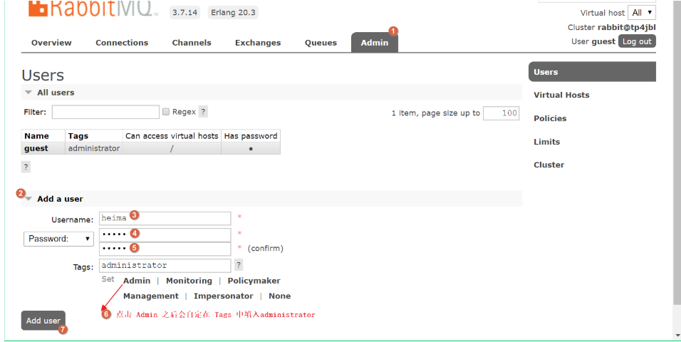 RabbitMQ在安装好后,可以访问http://localhost:15672 ;其自带了guest/guest的用户名和密码;如果需要创建自定义用户;那么也可以登录管理界面后,如下操作: