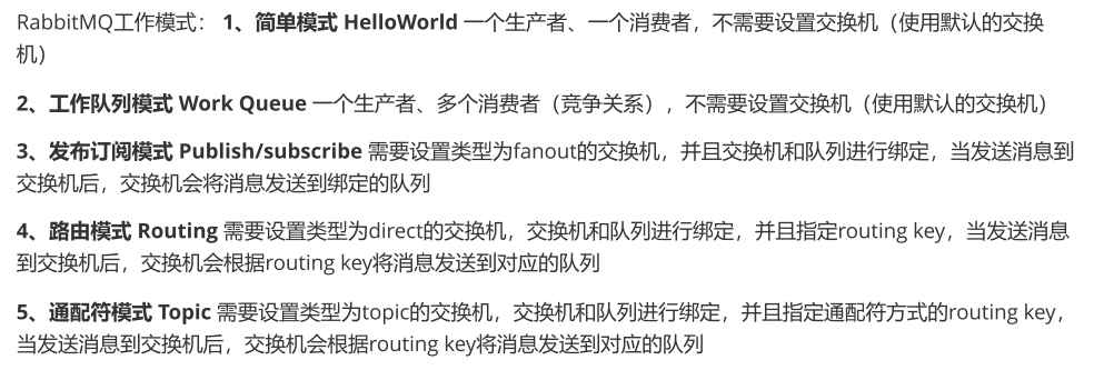 RabbitMQ提供了6种模式:简单模式,work模式,Publish/Subscribe发布与订阅模式,Routing路由模式,Topics 主题模式,RPC远程调用模式(远程调用,不太算MQ;不作介绍); 官网对应模式介绍:https://www.rabbitmq.com/getstarted.html