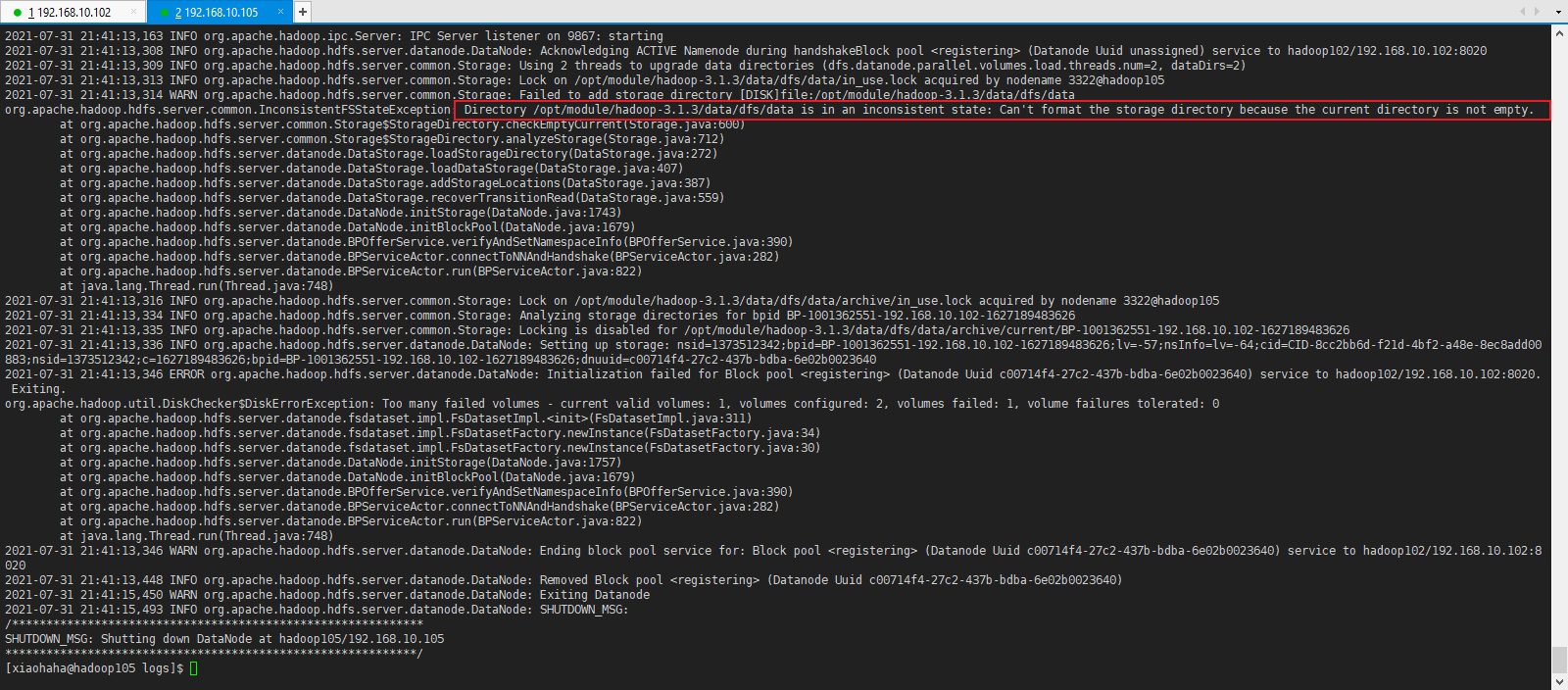 我在完成上面6步后,web页面是这样的,我多次刷新,发现我所属hadoop102和hadoop105的datanode总是交替出现,但不同时出现,这就很奇怪了 在网上搜了一下,原因是所属hadoop102和hadoop105的datanode的Uuid冲突,解决方法是删除current目录下的VERSION文件,然后重启dfs 然后我就将hadoop105的VERSION给删除了,位置是 $HADOOP_HOME/data/dfs/data/current,然后我重启dfs,发现hadoop105的datanode并没有跟着dfs启动,那肯定是哪个地方出错了,于是我就查看了hadoop105的datanode日志(位于 $HADOOP_HOME/logs/下),发现了问题所在: 翻译:目录/opt/module/hadoop-3.1.3/data/dfs/data处于不一致的状态:无法格式化存储目录,因为当前目录不是空的。 回顾文字开头链接里第十一节(集群崩溃处理方法),我们重新给hadoop105配置datanode,为它分配新的Uuid前,需要先删除其data与logs文件夹 所以我们需要在hadoop105的 $HADOOP_HOME目录下分别执行: rm -rf data rm -rf logs 重启dfs,即在hadoop102的 $HADOOP_HOME下分别执行sbin/stop-dfs.sh和sbin/start-dfs.sh。然后在hadoop105输入jps,发现datanode随着dfs启动而启动了。 web页面也正常了