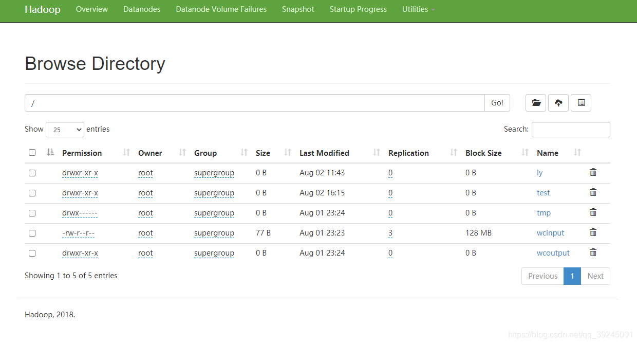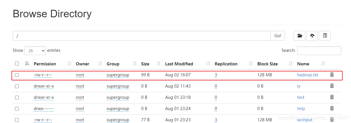 通过web进行查看 url: http://linux:50070/explorer.html#/ly/test 主机名称要根据自己设置的主机ip地址