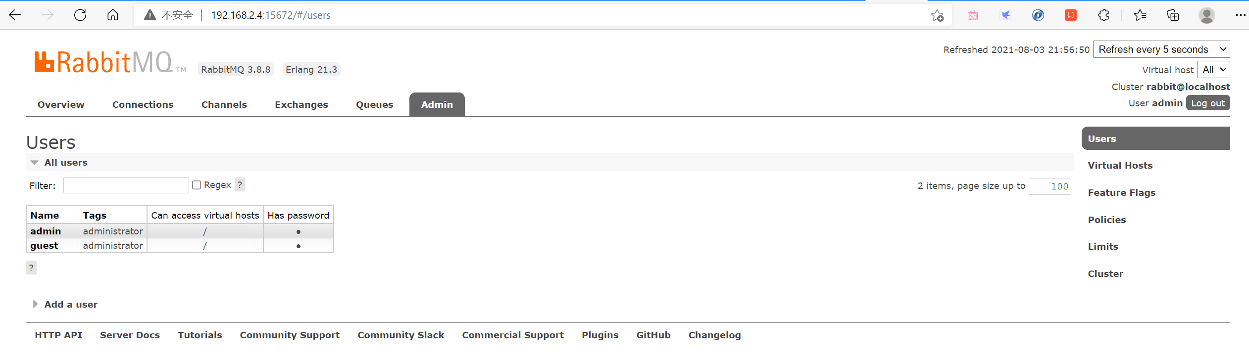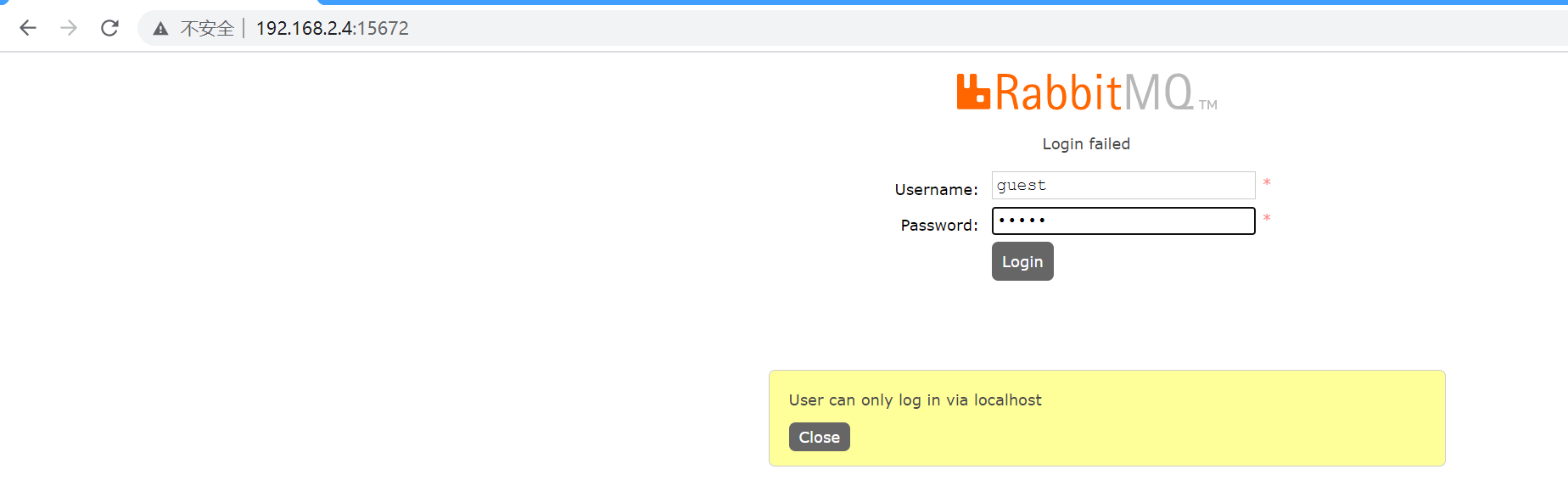访问 http://192.168.2.4:15672 ,用默认账号密码(guest)登录,出现权限问题。默认情况只能在 localhost 本机下访问,所以需要添加一个远程登录的用户  -