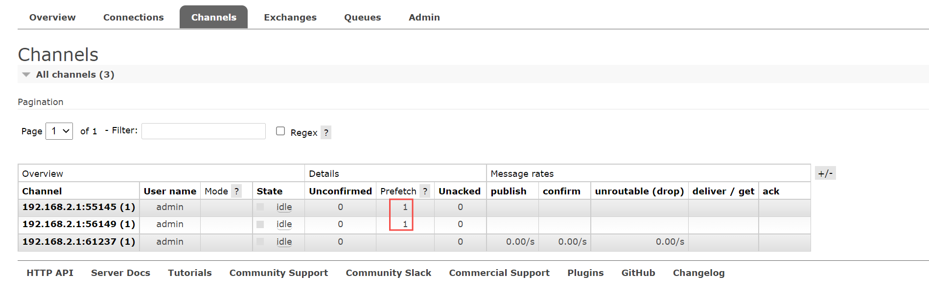 basicQos( prefetchCount = 1) 方法,来限制RabbitMQ只发不超过1条的消息给同一个消费者 。当消息处理完毕后,有了反馈,才会进行第二次发送 ;即:如果消费者还未将上次所给的消息进行ACK,就不要把新的消息转发给消费者,直到消费者对上次拿到的消息进行ACK。 - 注意: