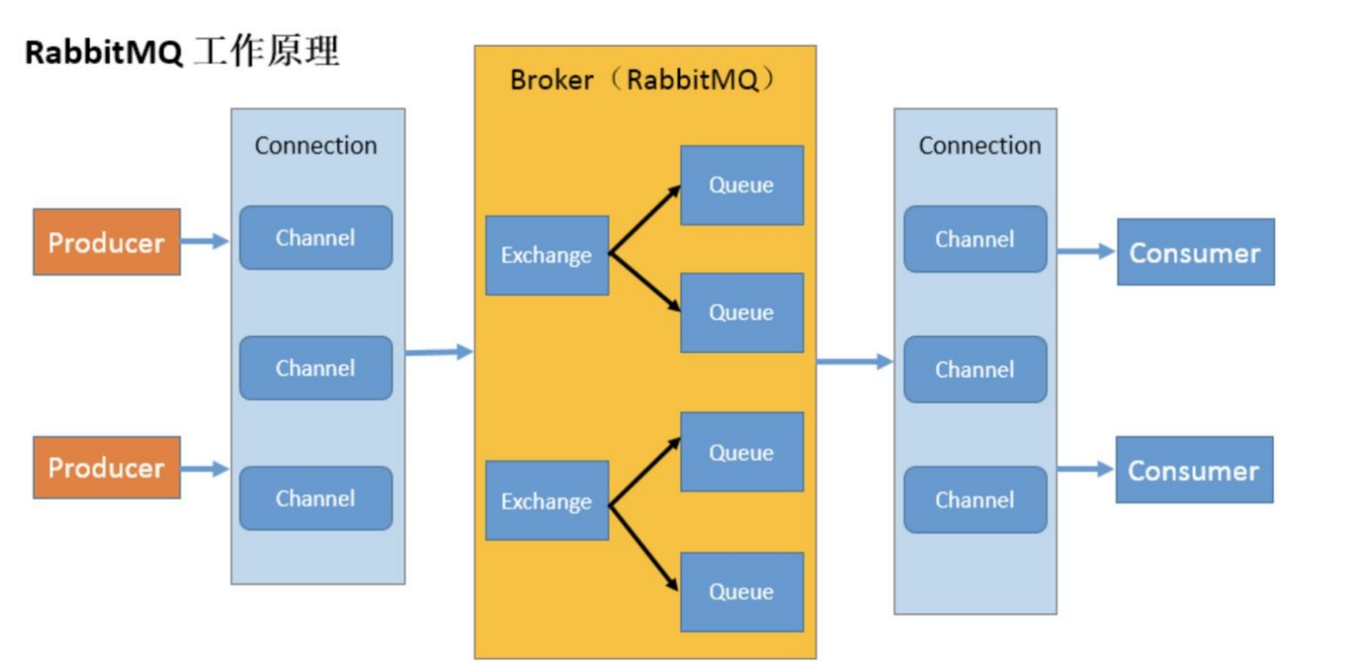 消息 通过Channel(信道)发送给Broker(服务器主体), Broker再分配给一个Exchange(交换机) - Exchange收到消息后, 通过消息中的