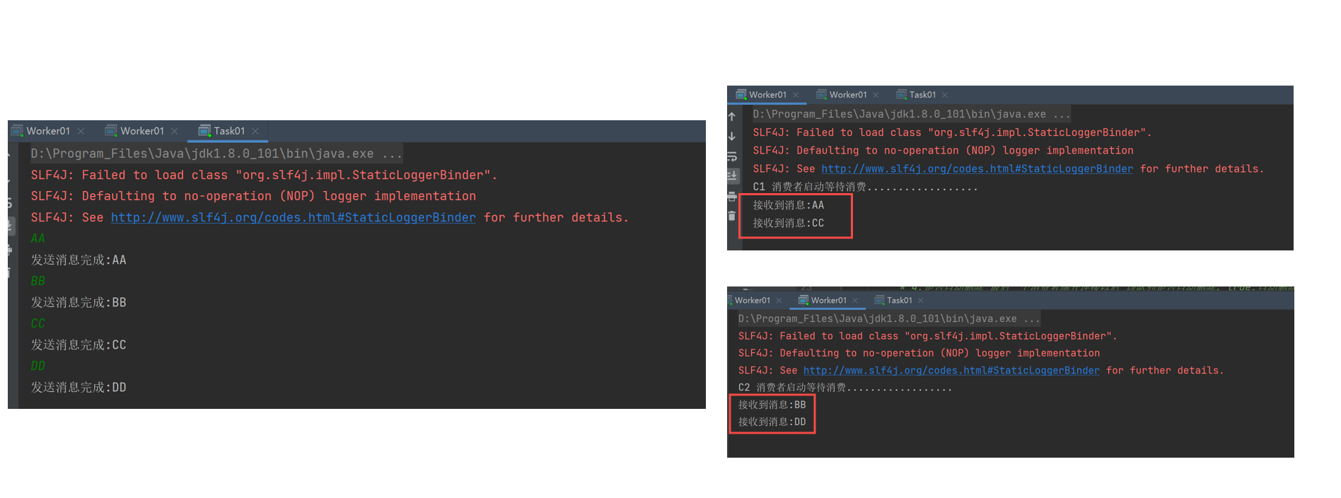 当发送AA ,BB ,CC ,DD消息时两个工作线程的执行情况  可以看到两个工作线程分别都获得了两个消息