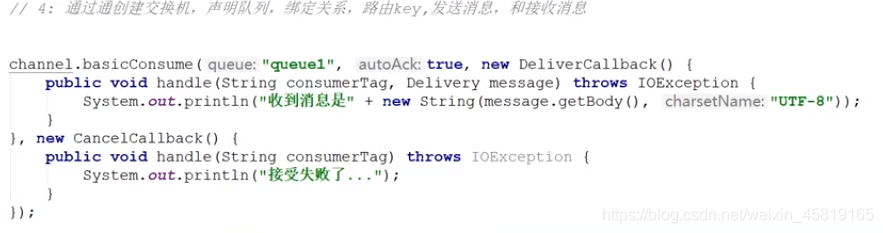 public class Customer2 {public static void main(String[] args) throws IOException {Connection connection = RabbitMqUtil.getConnection();Channel channel = connection.createChannel();channel.queueDeclare("work",true,false,false,null);channel.basicConsume("work",true,new DefaultConsumer(channel){@Overridepublic void handleDelivery(String consumerTag, Envelope envelope, AMQP.BasicProperties properties, byte[] body) throws IOException {System.out.println("Customer2消费消息:"+new String(body));}});}}