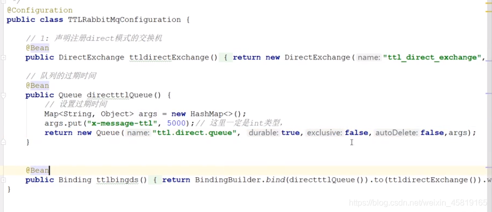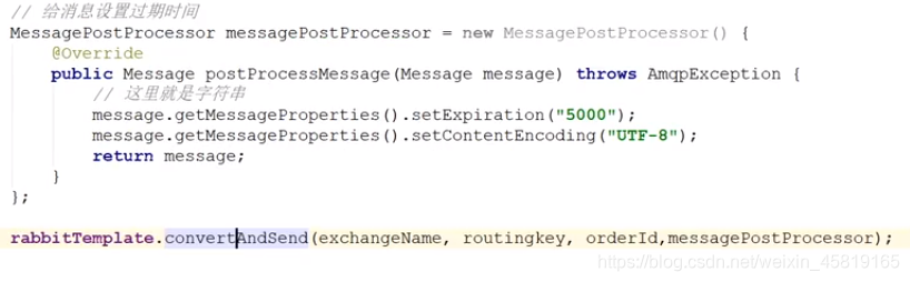 import org.springframework.amqp.core.Message;import org.springframework.amqp.rabbit.connection.CorrelationData;import org.springframework.amqp.rabbit.core.RabbitTemplate;import org.springframework.beans.factory.annotation.Autowired;import org.springframework.stereotype.Component;import javax.annotation.PostConstruct;@Componentpublic class MessageConfirmCallback implements RabbitTemplate.ConfirmCallback, RabbitTemplate.ReturnCallback {@Autowiredprivate RabbitTemplate rabbitTemplate;/*** * 创建RabbitTemplate对象之后执行当前方法,为模板对象设置回调确认方法* * 设置消息确认回调方法* * 设置消息回退回调方法* */@PostConstructpublic void initRabbitTemplate() {//设置消息确认回调方法rabbitTemplate.setConfirmCallback(this::confirm);rabbitTemplate.setReturnCallback(this::returnedMessage);}/*** 投递到交换机,不论投递成功还是失败都回调次方法* @param correlationData 投递相关数据* @param ack 是否投递到交换机* @param cause 投递失败原因* */@Overridepublic void confirm(CorrelationData correlationData, boolean ack, String cause) {if (ack) {System.out.println("消息进入交换机成功");} else {System.out.println("消息进入交换机失败, 失败原因:" + cause);}}/*** 当消息投递到交换机,交换机路由到消息队列中出现异常,执行returnedMessaged方法* @param message 投递消息内容* @param replyCode 返回错误状态码* @param replyText 返回错误内容* @param exchange 交换机名称* @param routingKey 路由键* */@Overridepublic void returnedMessage(Message message, int replyCode, String replyText, String exchange, String routingKey) {System.out.println("交换机路由至消息队列出错:>>>>>>>");System.out.println("交换机:" + exchange);System.out.println("路由键:" + routingKey);System.out.println("错误状态码:" + replyCode);System.out.println("错误原因:" + replyText);System.out.println("发送消息内容:" + message.toString());System.out.println("<<<<<<<<");}}