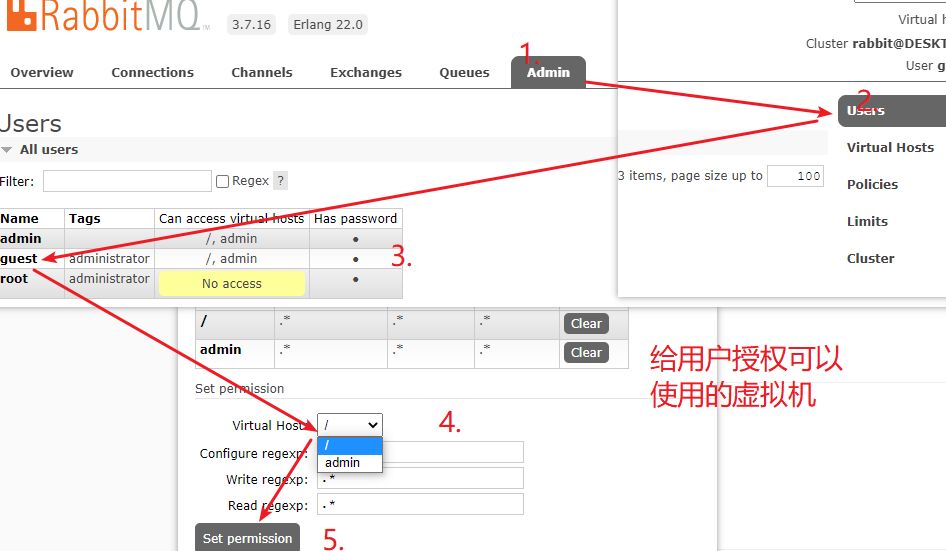 Users可以创建用户,Virtual Hosts创建虚拟主机