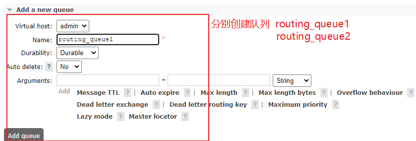 持久化:如果选durable,则队列消息自动持久化到磁盘上,如果选transient,则不会持久化; 自动删除:默认值no,如果yes,则在消息队列没有使用的情况下,队列自行删除。