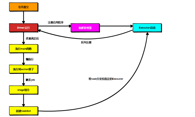 Driver 启动后向 Master 注册应用程序,Master 根据 submit 脚本的资源需求找到内部资源至少可以启动一个Executor 的所有 Worker,然后在这些 Worker 之间分配 Executor,Worker 上的 Executor 启动后会向Driver 反向注册,所有的 Executor 注册完成后,Driver 开始执行 main函数,之后执行到Action 算子时,开始划分Stage,每个 Stage 生成对应的 taskSet,之后将Task 分发到各个 Executor 上执行。
