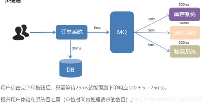 (1)应用解耦 MQ相当于一个中介,生产方式通过MQ与消费者交互,它将应用程序进行解耦。提升容错性和可维护性。  (2)任务异步处理 将不需要同步处理的并且耗时长的操作由消息队列通知消息接收方进行异步处理。提高了应用程序的响应速度。  (3)削峰填谷 如订单系统,在下单的时候就会往数据库中写数据。但是数据库只能支持每秒1000左右的并发写入,并发量再高就容易宕机。低峰期的时候并发也就100多个,但是在高峰期时候,并发量会突然增加到5000以上,这个时候数据库肯定卡死了。  消息被MQ保存起来了,然后系统就可以按照自己的消费能力来消费,比如每秒1000个消息,这样慢慢写入数据库,这样就不会卡死数据库了。  但是使用了MQ之后,限制消费消息的速度为1000,但是这样一来,高峰期产生的数据势必会被积压MQ中,高峰就被削掉了。但是因为消息积压,在高峰期过后的一段时间内,消费消息的速度还是会维持在1000QPS,直到消费完积压的消息,就叫做填谷。