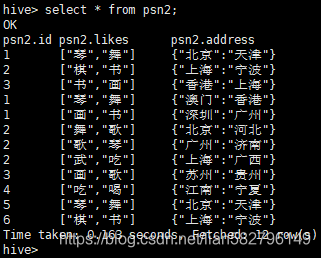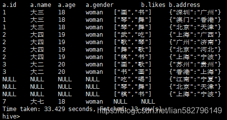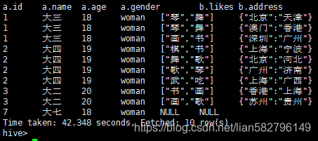 select a.id,a.name,a.age,a.gender,b.likes,b.address from psn as a cross join psn2 as b on (a.id=b.id);