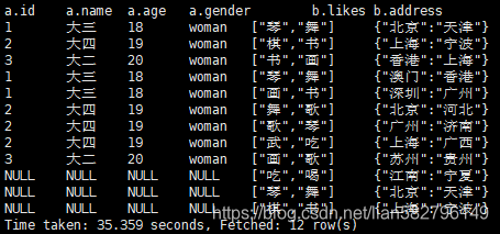 select a.id,a.name,a.age,a.gender,b.likes,b.address from psn as a right outer join psn2 as b on (a.id=b.id);