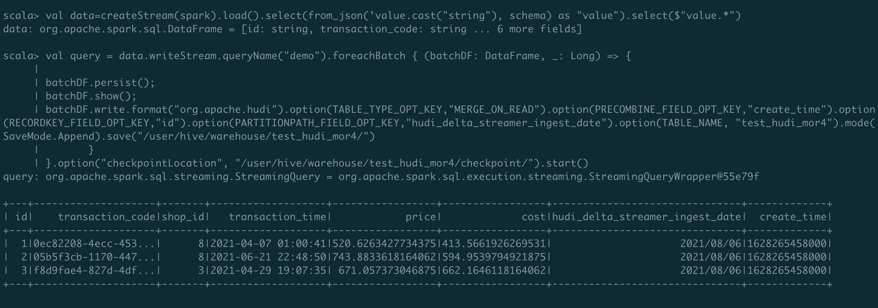 batchDF.write.format("org.apache.hudi").option(TABLE_TYPE_OPT_KEY,"MERGE_ON_READ").option(PRECOMBINE_FIELD_OPT_KEY,"create_time").option(RECORDKEY_FIELD_OPT_KEY,"id").option(PARTITIONPATH_FIELD_OPT_KEY,"hudi_delta_streamer_ingest_date").option(TABLE_NAME, "test_hudi_mor4").mode(SaveMode.Append).save("/user/hive/warehouse/test_hudi_mor4/")