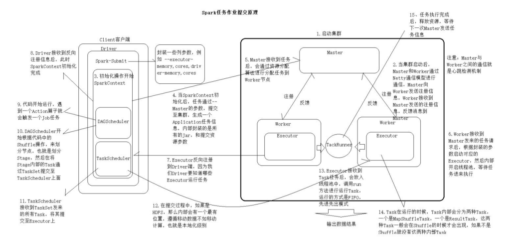 - Client中的SparkContext分配Task给CoarseGrainedExecutorBackend执行,CoarseGrainedExecutorBackend运?Task并向Driver汇报运?的状态和进度,以让Client随时掌握各个任务的运?状态,从?可以在任务失败时重新启动任务应?程序运?完成后,Client的SparkContext向ResourceManager申请注销并关闭自己