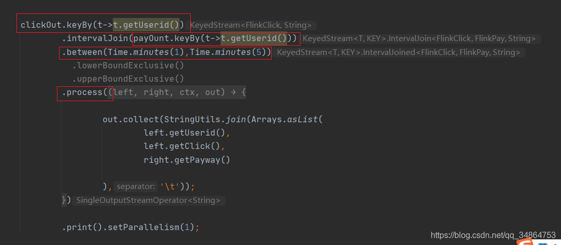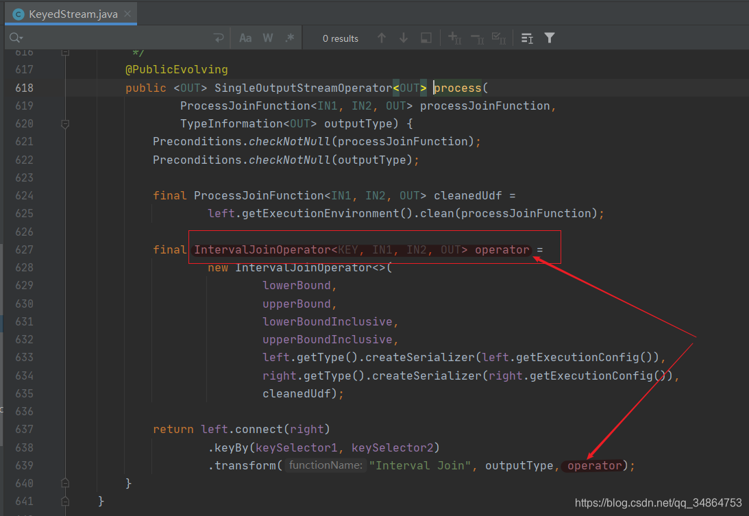 在这里return的是 left.connect(right).keyBy(keySelector1, keySelector2) , 因为left.connect(right)返回的是?ConnectedStreams,?keySelector1/2是指demo中两个数据流的keyBy条件,类似与flinksql join中的 on 换类了,现在是IntervalJoinOperator类中了,重点也就在IntervalJoinOperator中