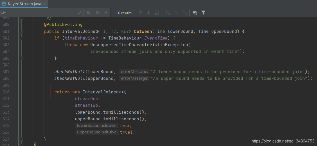 ?下面看下源码实现 intervalJoin 属于 KeyedStream,源码部分也在KeyedStream中