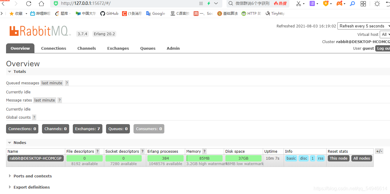 如果无法打开管理界面,则使用管理员打开cmd执行此命令:net stop RabbitMQ && net start RabbitMQ,重新打开管理界面即可