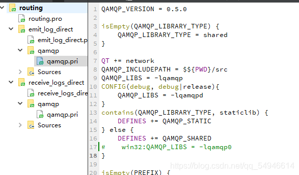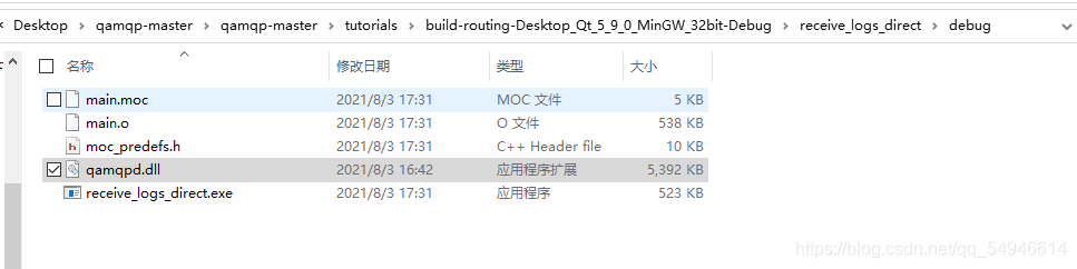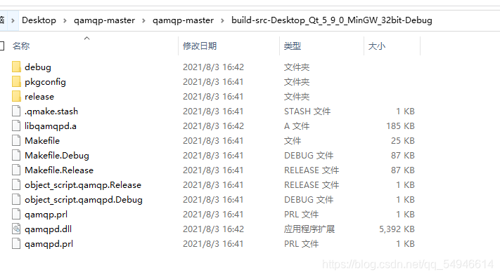 解压之后得到:qamqp-master 打开qamqp-master/src/src.pro文件并编译,在编译后的Debug下得到libqamqpd.a和qamqpd.dll