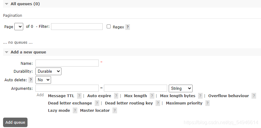 队列跟交换机共享某些属性,但是队列也有一些另外的属性。