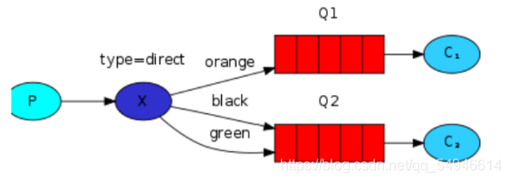 X:Exchange(交换机),接收生产者的消息,然后把消息递交给 与routing key完全匹配的队列 -