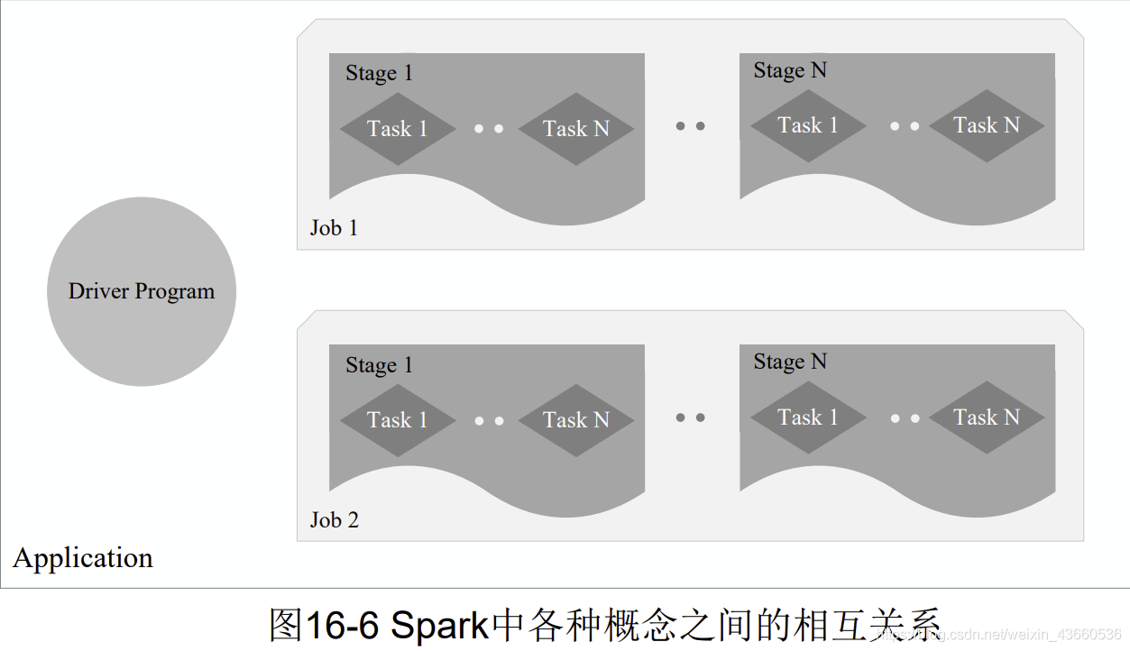 Job :包含多个Stage(阶段),与action算子一 一对应。Stage:一个job会被拆分成很多组任务Stage(就像MapReduce分为MapTask和ReduceTask一样)。- Task:一个被发送到executor上的工作单元。一个stage由多个Task组成(由partition决定)。