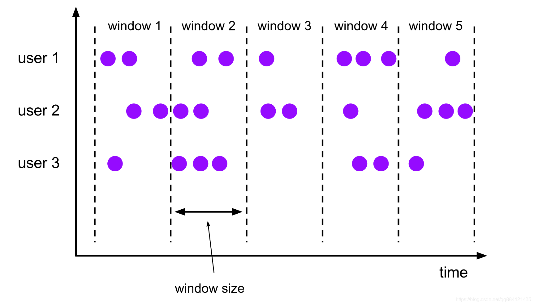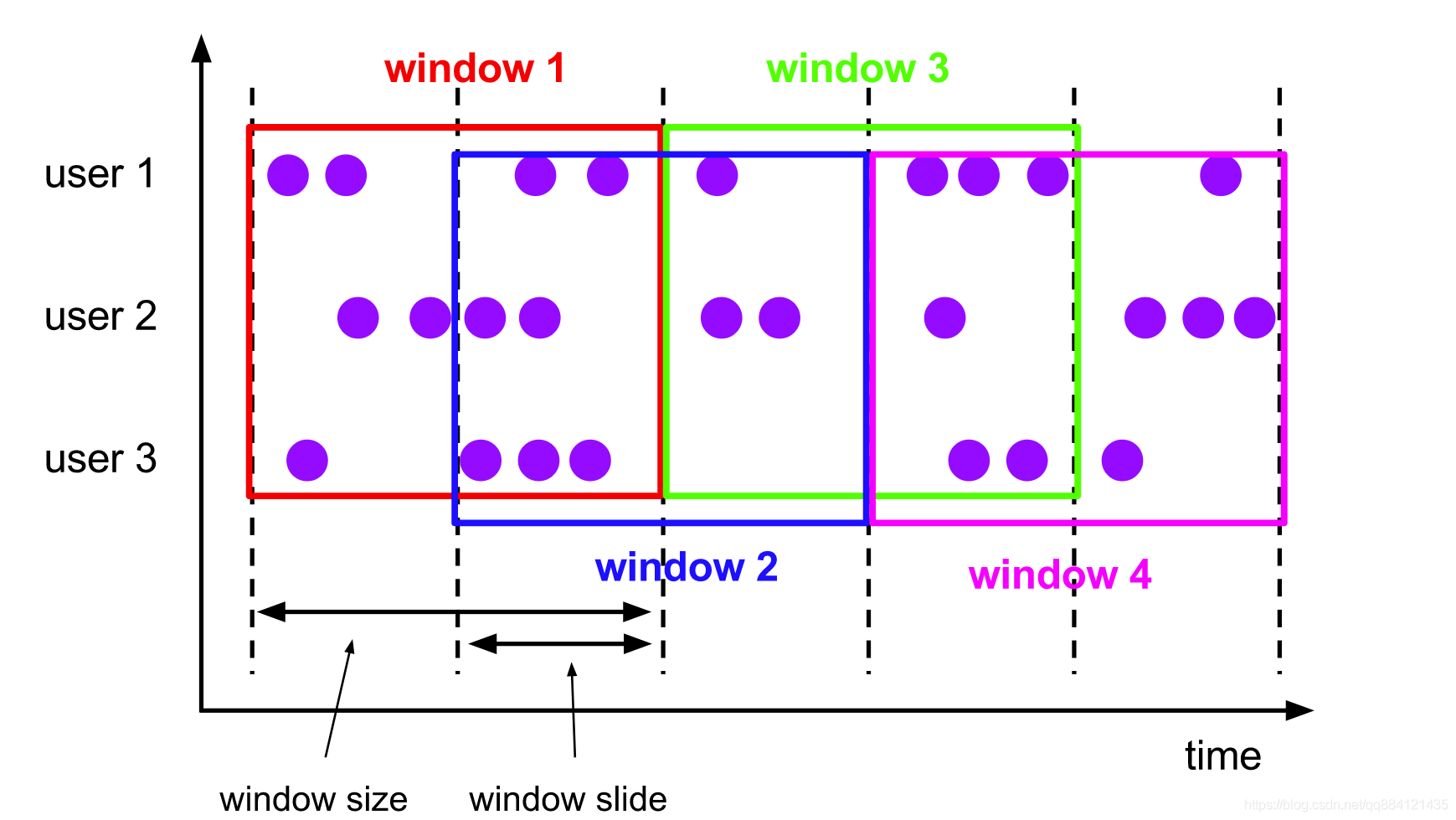 滑动窗口时固定窗口的更广义的一种新式,滑动窗口由固定的窗口长度和滑动间隔组成,滑动窗口分配器将元素分配到固定长度的窗口中,与滚动窗口类似,窗口的大小由窗口大小参数来配置,另一个窗口滑动参数控制滑动窗口开始的频率。因此,滑动窗口如果滑动参数小于窗口大小的话,窗口是可以重叠的,在这种情况下元素会被分配到多个窗口中。