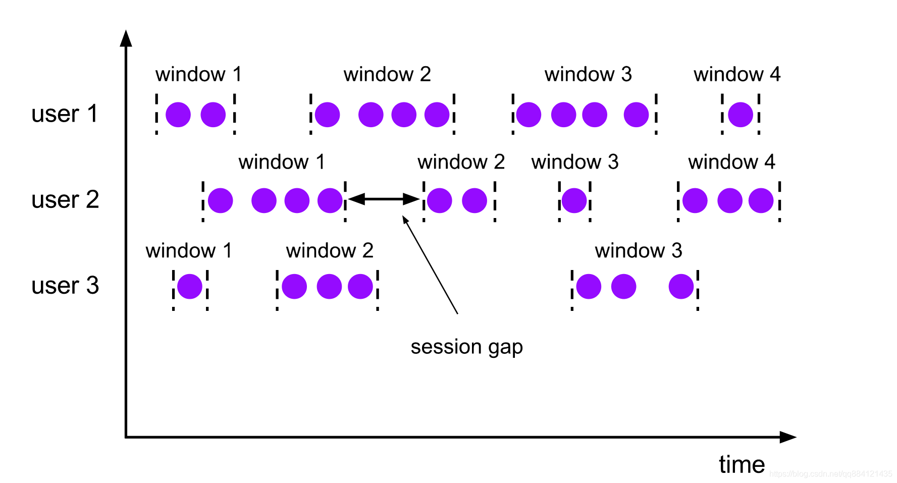 由一系列时间组合一个指定时间长度的timeout间隙组成,类似于web应用的session,也就是一段时间没有接收到新数据就会生成新的窗口。session窗口分配器通过session活动来对元素进行分组,session窗口跟滚动窗口和滑动窗口相比,不会有重叠和固定的开始时间和结束时间的情况,相反,当它在一个固定的时间周期内不再收到元素,即非活动间隔产生,那这个窗口就会关闭。一个session窗口通过一个session间隔来配置,那这个session间隔定义了非活跃周期的长度,但这个非活跃周期产生,那么当前的session将关闭并且后续的元素将被分配到新的session窗口中去。