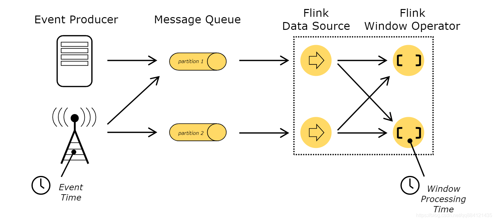 Event Time指的是数据流中每个元素或者每个事件自带的时间属性,一般是事件发生的时间。由于事件从发生到进入Flink时间算子之间有很多环节,一个较早发生的事件因为延迟可能较晚到达,因此使用Event Time意味着事件到达有可能是乱序的。