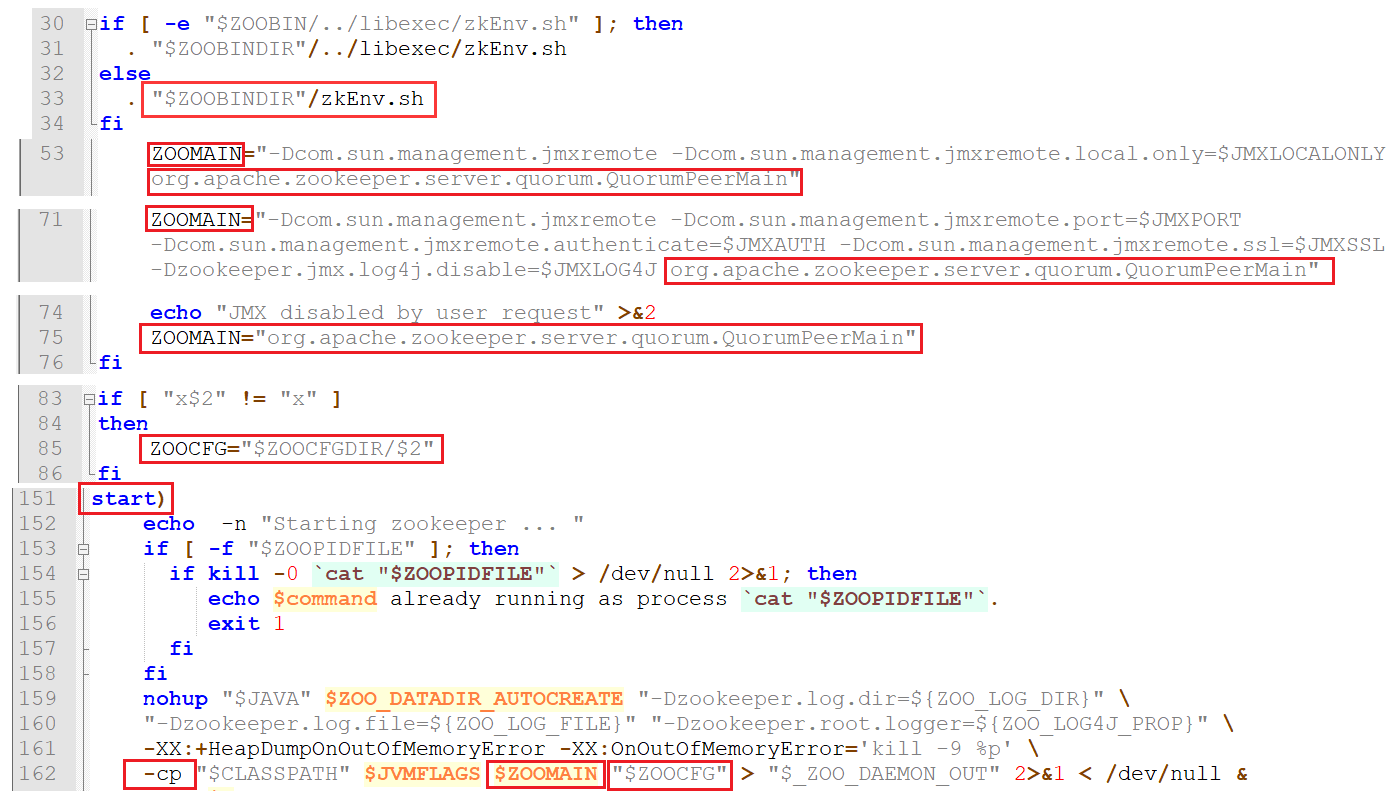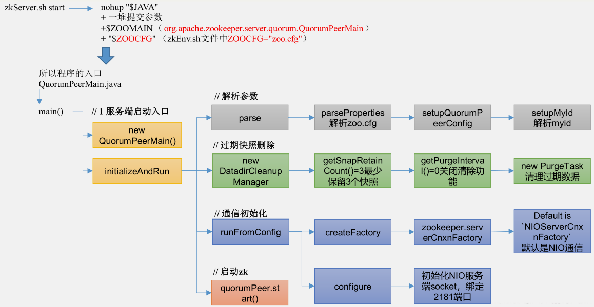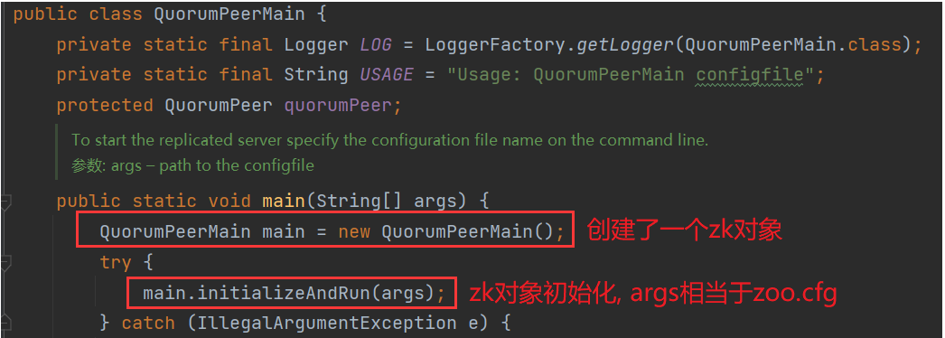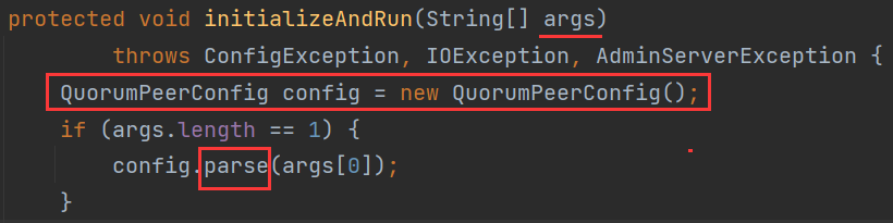 Zookeeper 服务端启动需要执行命令: zkServer.sh start, 因此我们应该查看这个脚本, 在这个脚本中可以看到如下内容👀  主要有两个参数: ZOOMAIN: 显然这个 QuorumPeerMain 就是程序的入口啦😉 ZOOCFG: 输入参数, 配置文件, 它的值不在这个脚本中, 而是在 zkEnv.sh中  所以, 这个 QuorumPeerMain 就是程序的入口, 接下来就到进入源码, 查看这个类的 main() 方法吧😉  接下来让我们进入 initializeAndRun(String[] args) 方法吧👀