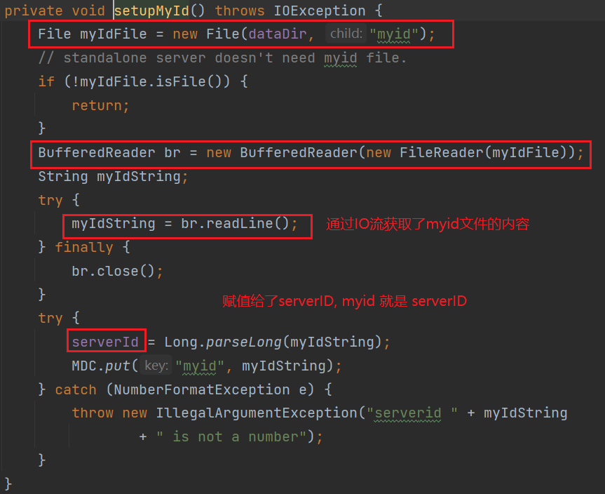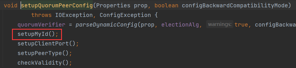 熟悉吗? 这些配置参数, 是我们在zoo.cfg中配置的😜, 让我们继续往下看源码  让我们进入 setupQuorumPeerConfig() 方法👀  还记得 myid 吗? myid是我们在安装 Zookeeper 集群时设置的, 在 dataDir路径下有一个名为 myid 的文件  到此为止, 解析参数就结束啦, 一个是解析 zoo.cfg 中的值, 另一个是解析 myid