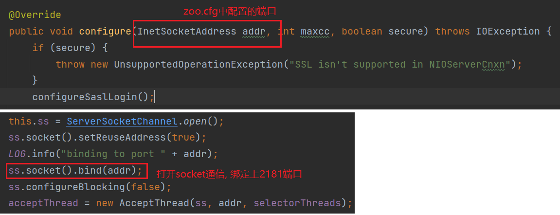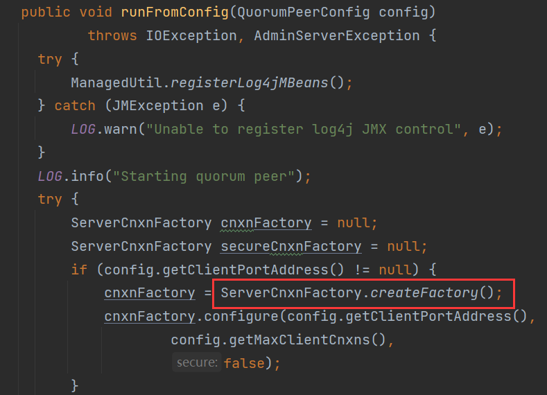 进入 runFromConfig() 方法  进入 createFactory() 方法:  这个 zookeeper.serverCnxnFactory 配置在 zookeeperAdmin.md 文件中  在这里, 我们发现服务端的通信默认是 NIO 通信😉, 然后我们回退到 runFromConfig() 方法  点击 configure()方法, 这里参数传了一个 config.getClientPortAddress()  发现有3个实现, 然后我们选择NIO实现😉  到此为止, 初始化NIO通信以及绑定socket端口2181结束, zookeeper服务准备启动啦😁